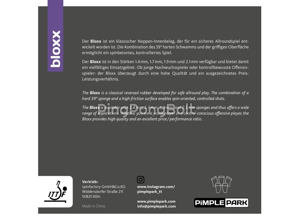 A PiMPLEPARK BLOXX egy kedvező árú, magas tapadású (gripű) sima, azaz noppen-innen borítás, amelyet kifejezetten az allround játékosok igényeire fejlesztettek ki. Vastagabb felső gumirétege jó élettartamot biztosít, miközben kiváló kontrollt és erős pörgetési lehetőségeket nyújt.