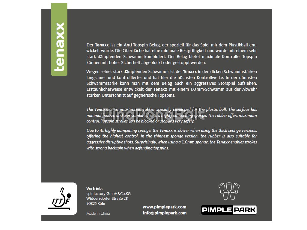 A PiMPLEPARK Tenaxx egy különleges anti-topspin (anti-spin) borítás, amely a slick és a klasszikus antik közé sorolható. Nem a hibára váró passzív védekezőknek készült, hanem olyan játékosoknak, akik a backhandet a támadás előkészítésére használják, majd forehanddel fejezik be a pontot.